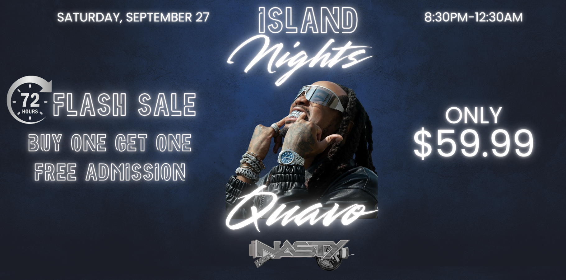 Adults Ages 21+ enjoy Island Nights: Live! Edition — two epic nights of DJs, after-dark slides, glow foam, and special live performances from Quavo (9/27) & Offset (10/11)!